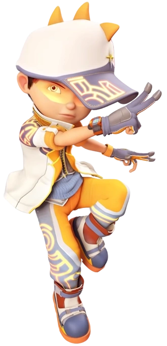 BoBoiBoy Solar mempunyai sarung kain putih di kedua tangannya.