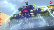 Probe bertukar menjadi Mega Probe untuk menyelamatkan seorang budak lelaki dari dihancurkan oleh papan iklan.