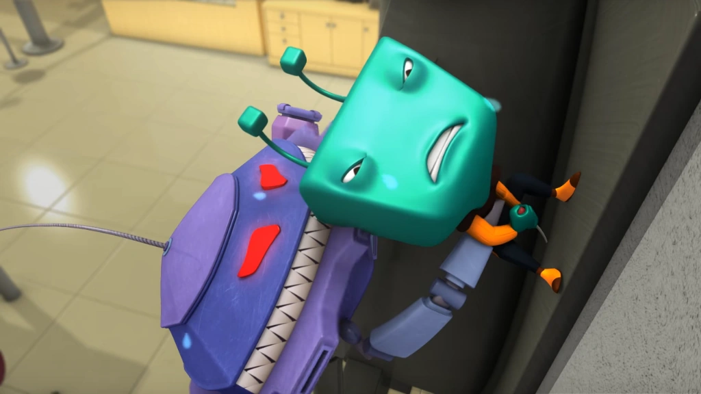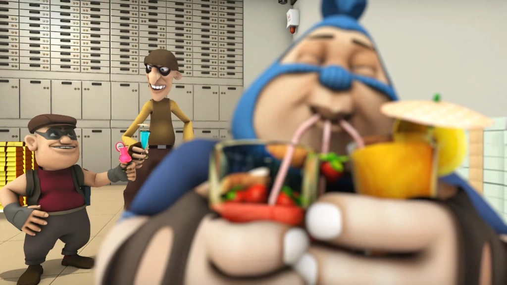 Rob, Robert dan Roberto menemani para tebusan di bilik kebal untuk melindungi diri mereka daripada polis, ketika itu BoBoiBoy dan kawan-kawannya datang untuk menyelamatkan tebusan. Sekali terdengar ketukan pintu dan suara wira cilik itu memanggil supaya pintu dibuka, perompak bertiga itu terasa gertak, tetapi Rob dengan senang hatinya pergi membuka pintu untuk meminta autograf BoBoiBoy. Lantas Roberto terus mengherdik tindakan Rob kerana takut mereka bertiga akan dibelasah oleh BoBoiBoy lalu mengetatkan semula pembuka pintu. Ekoran daripada itu, Fang mahu memecahkan pintu dengan menggunakan kuasanya, tetapi dihalang oleh Yaya yang meminta supaya mengambil kira tentang keselamatan tebusan.