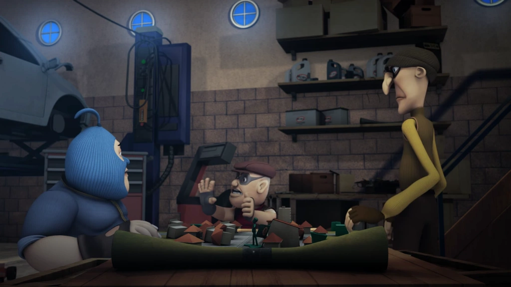 Sementara itu, suatu mesyuarat rahsia tiga orang penjenayah sedang berlangsung di sebuah bengkel kereta yang terbiar dalam rancangan untuk merompak pada keesokan harinya. Si ketua yang bantut dan berbaju serba merah menyoal semula konco-konconya tentang rancangan mereka. Pada pukul 7:56 pagi, mereka akan berada di stesen minyak dan kemudian mereka akan bergerak selama 41 saat ke lokasi kejadian, iaitu di hadapan bank. Dan mereka akan menunggu waktu pertukaran pengawal keselamatan. Yang dempak serba biru pula perlu memerhatikan pengurus bank yang dijangkakan dia akan keluar dari kedai roti tepat pada pukul 8:03 minit pagi.
