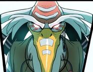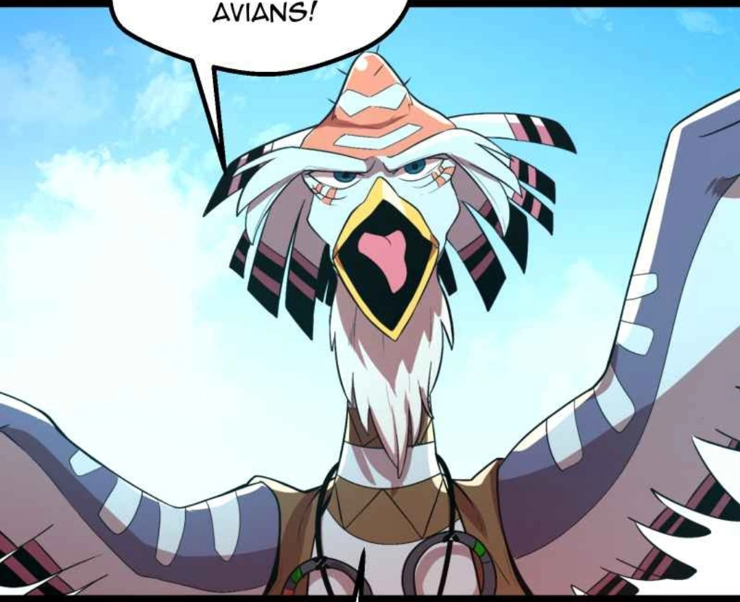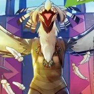 Leader Ngau has white feathers on his whole body except for a bump-type bald orange patch on his head. The ends of his white feathers are black stripped. He uses a staff to stand.