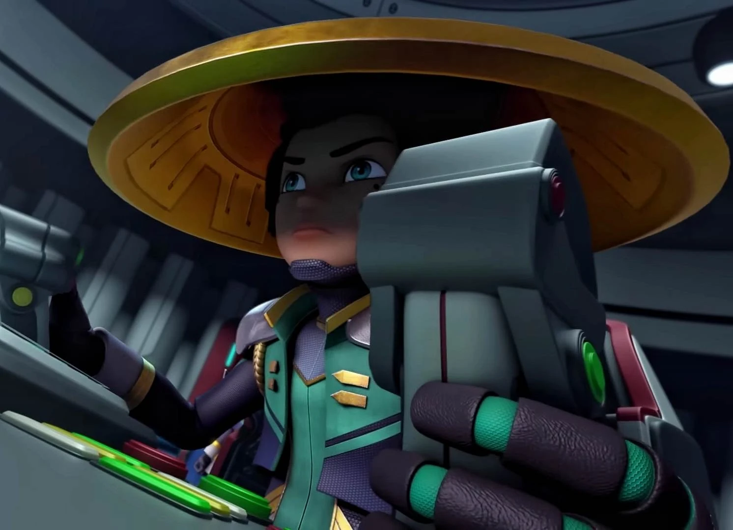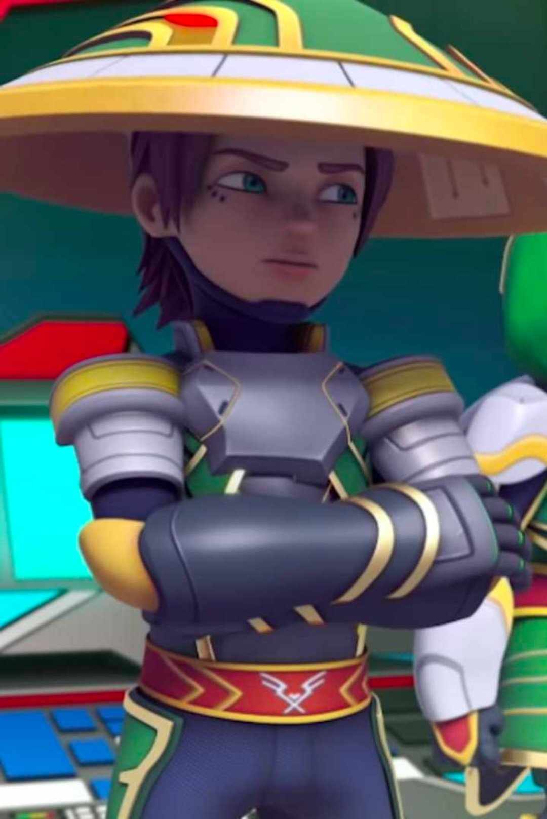 Sai's clothing consists of traditional attire similar to that of a ninja, showcasing a combination of yellow, green, black and red colours. His clothing is fortified with armor and metallic elements to ensure extensive protection, his waist features a red belt with edges made out of gold and a white emblem that further enhances its uniqueness. In addition, Sai dons his shield weapon in the form of an Asian conical hat, which affords him both defense and convenience. Both him and his twin have three dots below their eyes which seem to be their birthmarks.