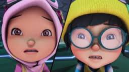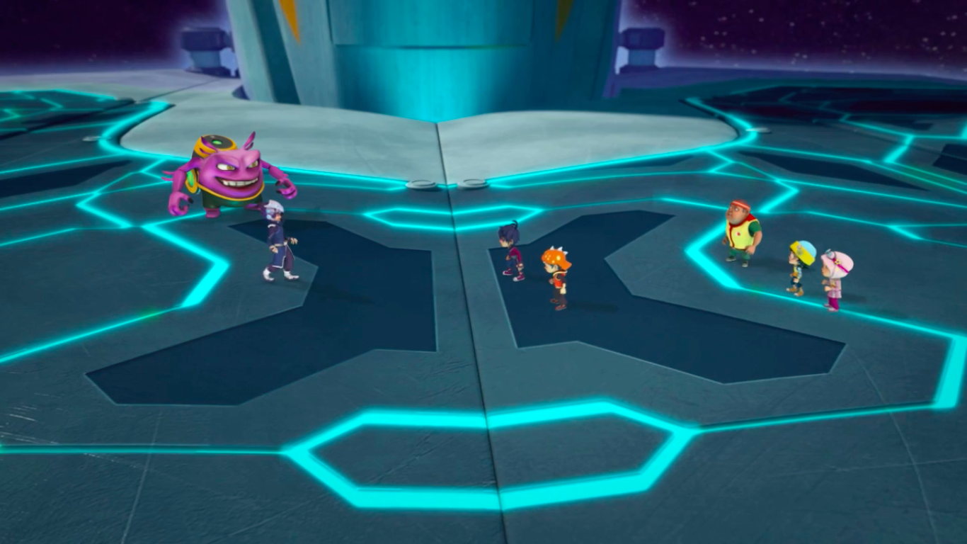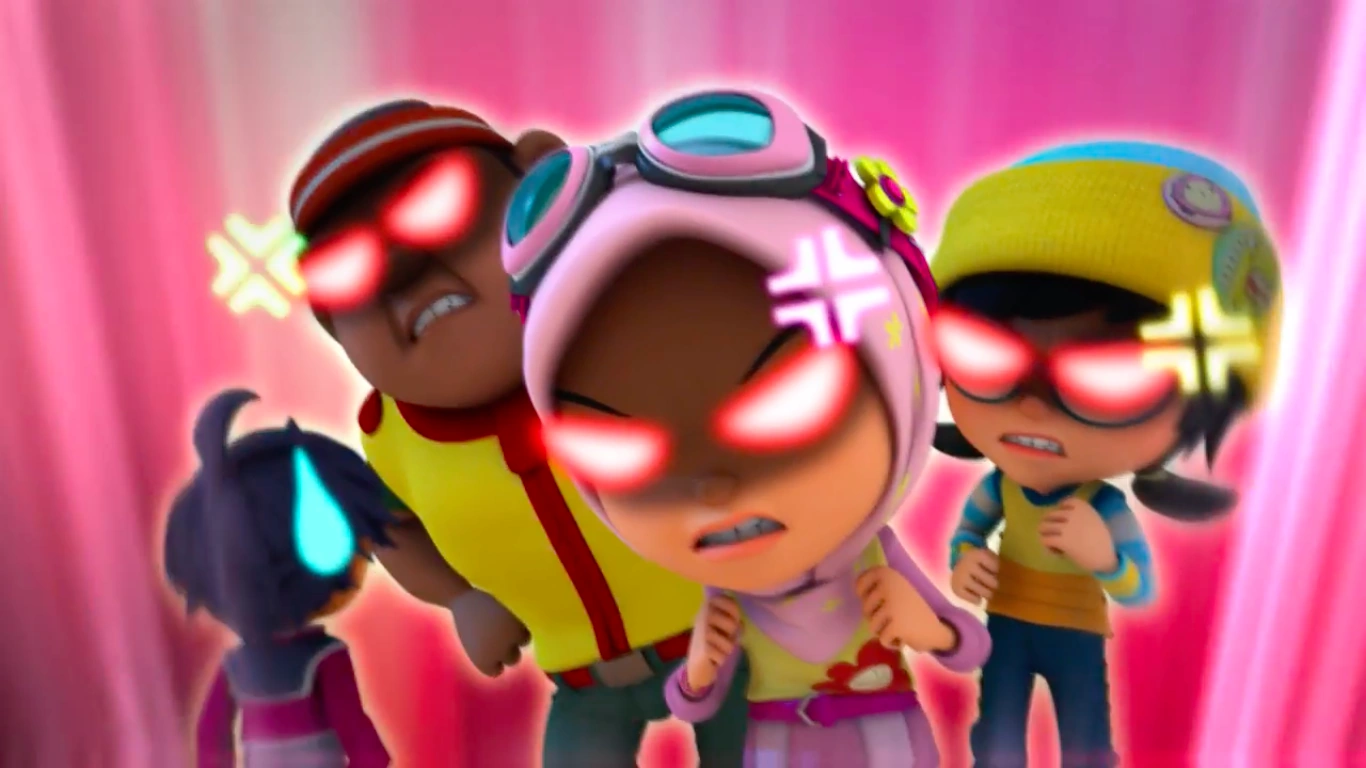 An explosion from Kaizo’s sword urges Yaya, Ying, and Gopal to help their friends, but they’re stopped by Lahap’s Toxic Plasma. Yaya and Ying try to attack him, but Lahap armours himself by eating pieces of spaceship’s steel. The girls’ attacks rebound off his steeled body, injuring their hands and feet.