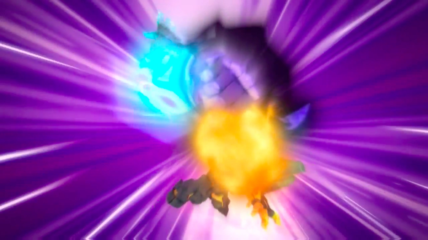Fang and BoBoiBoy do a Combo attack and Kaizo struggles to sustain a shield against the three Golems. They break his shield, and the resulting explosion from the impact of their punches cracks Kaizo's mask and throws him against the ship's wall. This act confirms BoBoiBoy's gang's victory.
